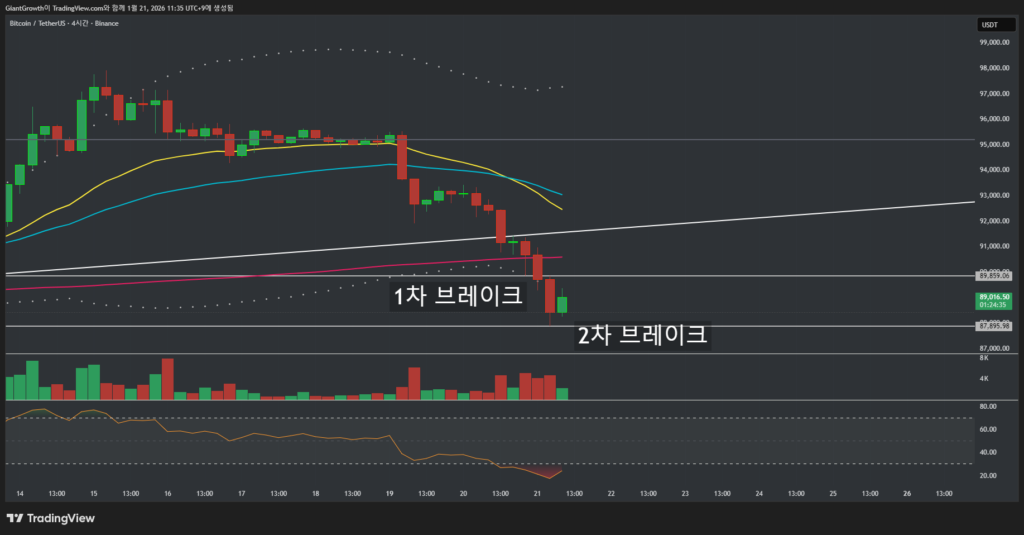 비트코인 4시간봉입니다. 1차 브레이크 89k 부근에서 꼬리달고 반등을 시도하여 망치 캔들로 마무리하였지만 애초에 빠르게 먹고 나오기로 계획했기 때문에(계획은 지켜야 계획입니다.) 바로 매매를 종료하였습니다. 지지선이 저항선으로 바뀐 상황에서 머리 바로 위에 천장이 있는데 더 끌고 가는 것은 이해 못 할 매매가 되는 거죠.